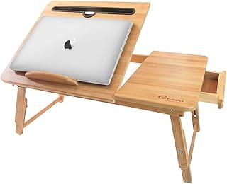 ノートパソコンデスク ベッドテーブル ノートパソコンスタンド 折りたたみ ラップトップスタンド ローデスク 昇降式 高さ調整 角度調整 凹溝付き タブレット 縦置き機能 引き出し付き ナチュラル 竹製 (55*35 天板調整&高さ調整 Aタイプ)