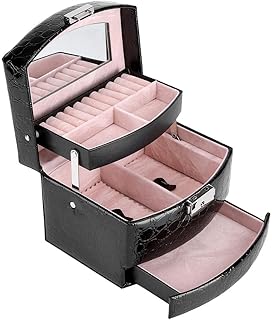 3層ジュエリーボックス – ネックレスリングストレージオーガナイザー ジュエリートラベルケース ロック付き ネックレス、イヤリング、指輪、腕時計、レディーギフト家庭用品用 ブラック CASE-077YB