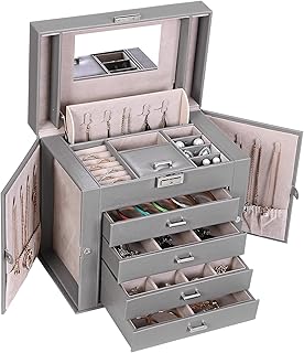 ANWBROAD 6段 大型ジュエリーボックスジュエリーオーガナイザーボックス ディスプレイストレージケースホルダー ロックミラー付き ガールズジュエリーボックス イヤリング リング ネックレス ブレスレット イヤリング ギフト グレー フェイクレザー UJJB004H