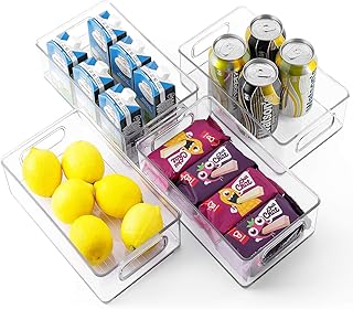 TIMART パントリーオーガナイザーボックス 積み重ね可能 ハンドル付き クリアプラスチックストレージビン 冷蔵庫 冷凍庫 キッチン カウンタートップ キャビネット用 4個パック
