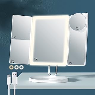 TOUCHBeauty 三つ折りメイクアップミラー バニティメイクアップミラー LEDライト34個付き 1X/2X/3X/7倍拡大鏡照明付き 調光機能付き コスメミラー